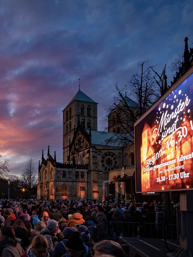 Alle Münsteranerinnen und Münsteraner sowie Gäste sind eingeladen, gemeinsam auf dem Domplatz Weihnachtslieder zu singen. David Rauterberg, der „Vater des Rudelsingens”, begleitet das Singen live von der Bühne und sorgt für eine stimmungsvolle Atmosphäre. Groß und Klein, Alt und Jung sind herzlich willkommen, an diesem weihnachtlichen Event teilzunehmen.